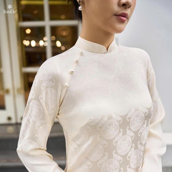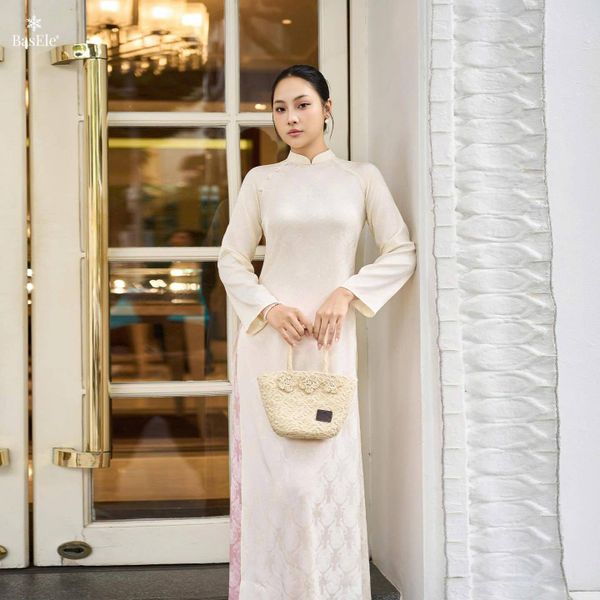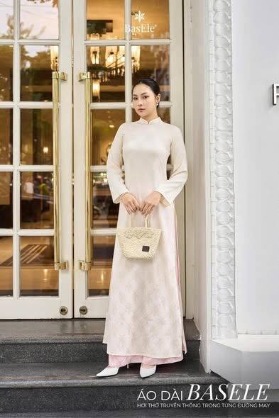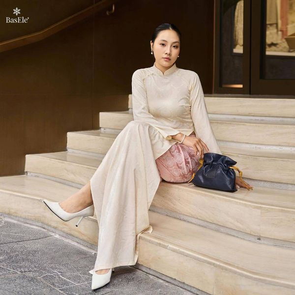 Nền gấm cùng họa tiết thọ dơi được dệt tinh xảo - biểu tượng của phúc lành và may mắn, mang đến chiều sâu văn hóa và sự thanh lịch trong từng chi tiết. BasEle đã khéo léo hòa trộn giữa be dịu dàng và hồng pastel trong bộ áo dài, tạo nên sắc độ mềm mại, tinh tế, giúp tổng thể trang phục thêm phần ngọt ngào và cuốn hút.